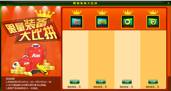 活动内容:在活动期间内,VIP功能的玩家一定要来参与限量装备大比拼活动。把自己5级和6级限量装备拿出来炫耀一下,只需5000银币就可以报名比拼喽~谁的限量装备能夺得排行榜第一呢?榜首第一者奖励银币双倍卡、回豆卡、立即返回卡、跳过次数卡,还有专属球队头像及上线提示呢~