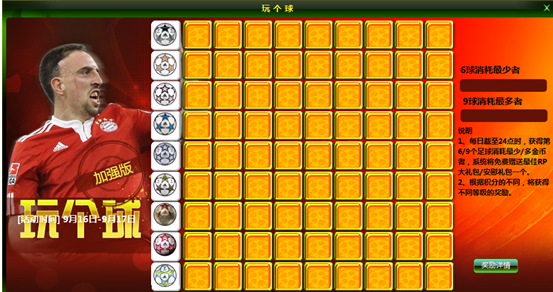 3、活动期间,每日截止24:00时,翻得第6个球消耗最少金币者,系统将免费赠送最佳RP大礼包,礼包内含:7级合同一个,5级装备套一套,战术积分卡10000点。同时,获得第9个球消耗最多金币者,系统将免费赠送安慰礼包,礼包内含:球员经验卡10000点,训练卡100000点,战术积分卡10000点,袖标4级*1。最佳RP礼包及安慰礼包会直接发放到符合条件的玩家背包中。