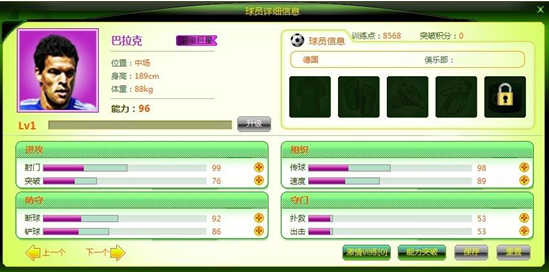 温馨提示:初始能力升级后,保留等级、世界杯积分、激情值、突破积分,但会卸下训练点,若球队中(阵容、战术中心)有多个巨星巴拉克,会选取能力高的巴拉克进行升级。