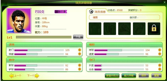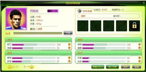 4、玩家拥有了初始能力103的巴拉克后,还可以去商城购买价值2999金币的巴拉克再升级礼包,礼包内含:8级合同*1,训练卡10000*10,6级装备套*1,4级袖标*1。购买巴拉克再升级礼包然后点击“再升级”,巴拉克的初始能力会再次升级至105!同样,升级后保留等级、世界杯积分、激情值、突破积分,但会卸下训练点。