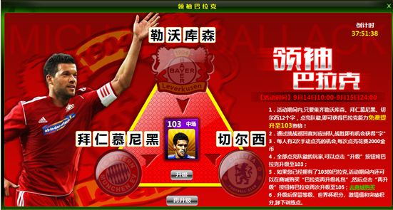 活动内容:在活动期间,来玩“领袖巴拉克”。玩家只要通过打巡回赛勒沃库森、拜仁慕尼黑、切尔西,每胜一场将有机会获得1个应球队名称的中文字,只要三支球队的的队名全部点亮,就可以提升巴拉克的初始能力。