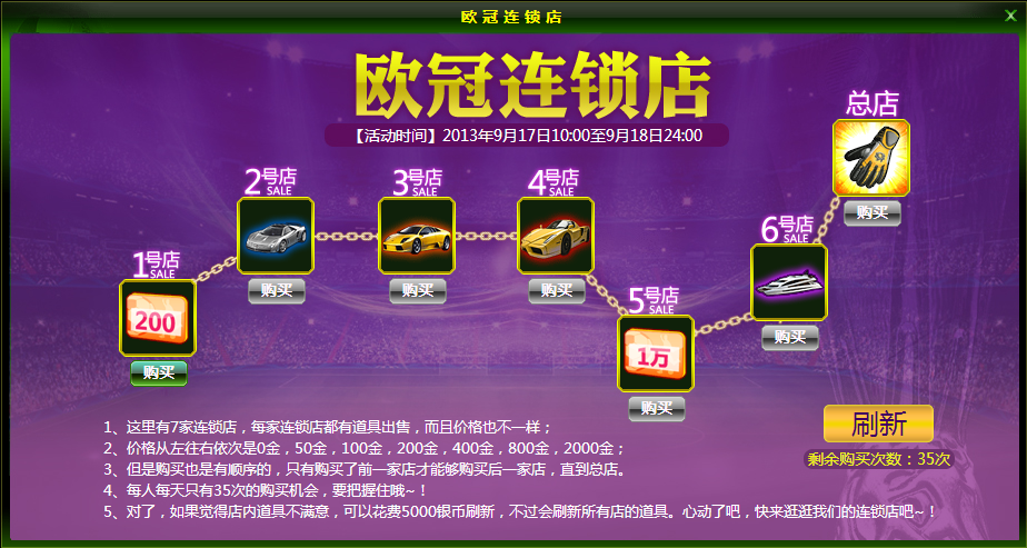 活动内容:在活动期间内,让我们一起涌入“欧冠连锁店”吧,界面中依次有7家店铺,每家店铺都出售一种道具。玩家按照店铺顺序购买,1号店道具免费购买喔~剩下的店铺需使用金币(活动券)购买道具。每人每天能购买35次呢~如果你对上架的道具不满意,还可以消耗5000银币刷新哟,说不定能刷出更好的道具呢~