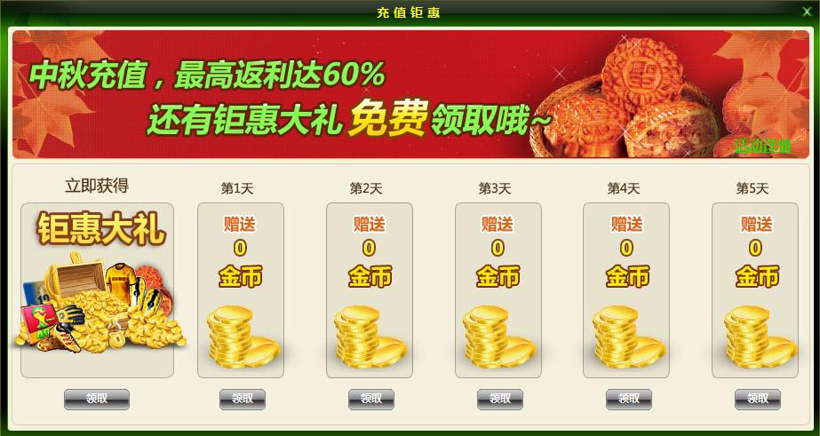 在充值活动期间玩家累计充值大于等于50000金币,返还充值金币额60%