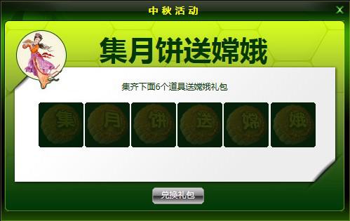 2、 以上六款礼包中,每个礼包都会有一个字样的月饼,只要购买礼包集齐“集”、“月”、“饼”、“送”、“嫦”、“娥”这六个月饼就可以兑换嫦娥礼盒,每个礼包售价299金币。每个礼包限购3个。
