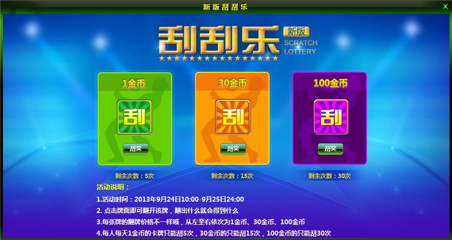 2、每人每个活动日刮奖有次数限制。标价1金币的牌每人每个活动日限刮5次;标价30金币的牌每人每个活动日限刮15次;标价100金币的牌每人每个活动日限刮30次。