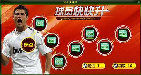 活动内容:在活动期间参与“球员快快升”活动,玩家从原点开始,通过消耗金币前进,第一步仅需3金币,玩家前进中可领取停留格内的球员经验卡一张,第七步格内有10000点球员经验卡等你来夺。领取经验卡的次数限量哦~如此良机怎容错过,球员快快升!