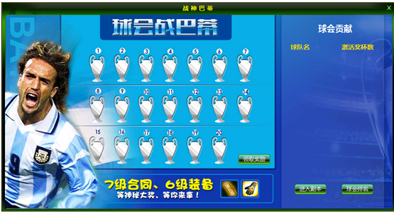 活动内容:“球会战巴蒂”本活动以球会为单位进行,球会成员每通关一次巴蒂副本可随机获取并点亮一个对应号码的奖杯,此时球会成员可领取一次对应号码奖杯的专属奖励,更值得期待全部奖杯点亮时的最终大奖呢!奖励领取次数有限,快与战神同福享!