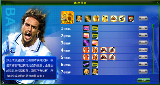 2、 球会成员每通关一次巴蒂副本,即可随机获得某号码奖杯,每一个奖杯对应一个大奖,当所有奖杯都点亮,球会中符合领取条件的成员均可领取最终大奖。奖励每人限领1次。
