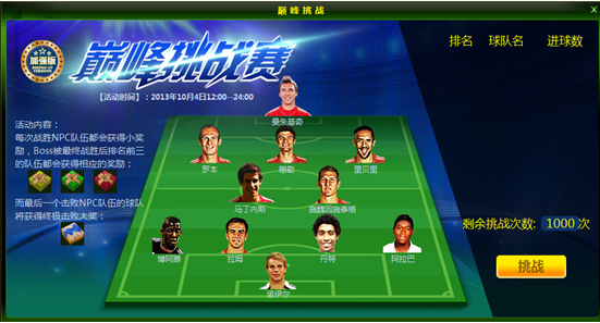 活动内容:活动期间,玩家参与“巅峰挑战赛”活动,即可挑战拜仁慕尼黑,获胜即可获得银币、训练点和声望,单服达到1000场胜场的时候,根据进球数量对玩家进行排名,前三名玩家有神秘礼包奥,更有一份终极击败大奖献给单服取得第1000场胜利的玩家哟~机会难得,快来挑战吧。