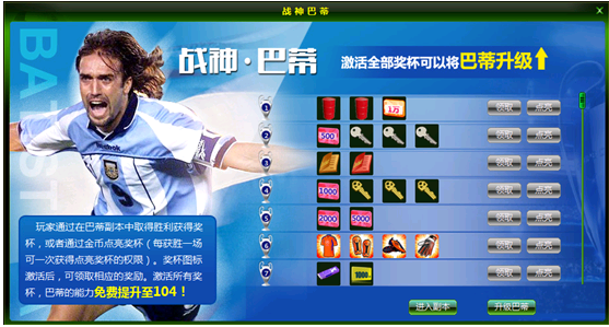 活动内容:在活动期间内,参加“战神巴蒂”活动。玩家每胜一场巴蒂副本的比赛除了可抽得常规奖励之外还可以随机获得一个奖杯,玩家可领取对应号码奖杯的奖励。不仅如此,每胜一场巴蒂副本的比赛更可以获得一个奖杯的激活权限,玩家可花费一定金币立即点亮此奖杯获得奖励哟~当全部奖杯都点亮后,玩家签约巴蒂副本的巨星巴蒂斯图塔可手动升级初始能力至104。