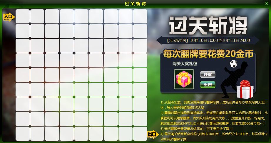活动内容:在活动期间内,玩家参与“过关斩将”活动。过关斩将好玩的不得了,该活动从入口开始翻牌,每翻一张牌仅需20金币,如果翻出的是道具可直接获取,如果是拦截球队则要战胜这支球队或者消耗500金币跳过这支球队才能继续翻牌。成功闯关的玩家能够领取闯关大奖礼包咧,闯关大礼包玩家每天仅限领取5次哟~过五关斩六将,好汉收获颇丰!
