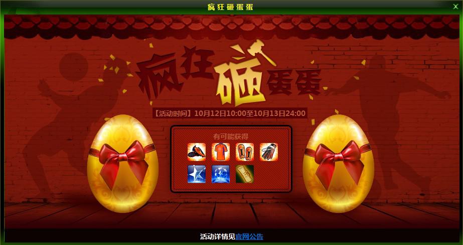 活动内容:在活动期间内,我们一起疯狂砸双蛋。在活动界面中,两颗超大金蛋在眼前,玩家每次任选一颗蛋把它砸开,如果砸开的是道具材料立马领取,像7级合同、欧冠之魂、球员经验卡、限量积分、战术积分等等诸多道具有可能被你砸出来哟~玩家每天第一次砸蛋是免费的哟,此后每砸一次只需消耗10金币呢~