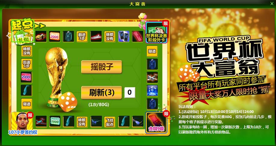活动内容:在“世界杯大富翁”活动期间内,您仅需消耗80金币即可掷1次骰子,骰子显示几点就走几步。在世界杯大富翁之路上,竟有全区全服限量投放的世界杯PVP系列赛事的决赛阶段外卡,在世界杯跨服赛中那些遗憾未能晋级决赛的玩家如果拥有了这张卡片,就可以再次挺进世界杯跨服赛决赛阶段的比赛喽~世界杯好机会,向决赛进军!