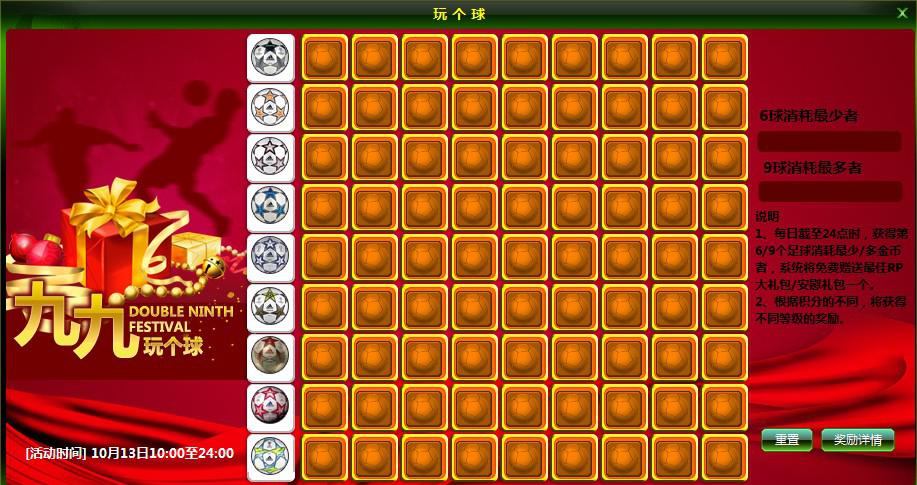 活动内容:在活动期间内,玩个球活动 81张幸运卡片等你翻,每组都暗藏一颗对应花色的中奖彩球,最低500银币就有可能让你翻出幸运之球,球球翻的越多,奖励就越丰厚。“玩个球”9球大奖实在好有诱惑力,球球在等你,做就做最幸运的人,看看你能不能拿到最佳RP奖!