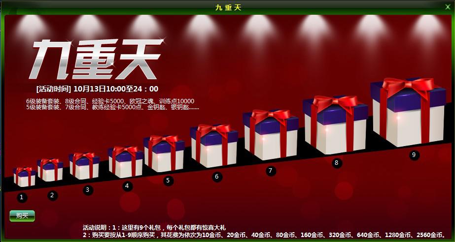 活动内容:在活动期间内,玩家来玩“九重天”,可阶梯状进行购买阶梯礼包,6级装备套,8级合同,签名积分卡10000点,欧冠之魂等等美焕道具在等你,而礼包超级优惠价10金币起点燃重阳节的激情,只有在购买底层礼包成功后,才能购买相邻上一层礼包哦!优惠无限多,豪礼登高我们一起来!