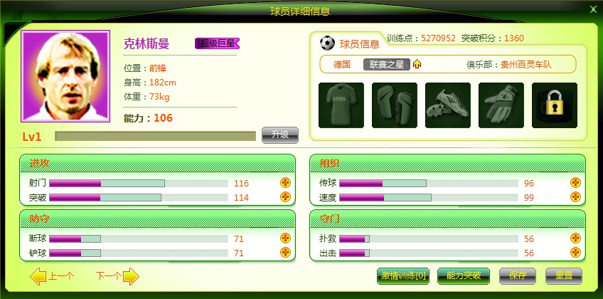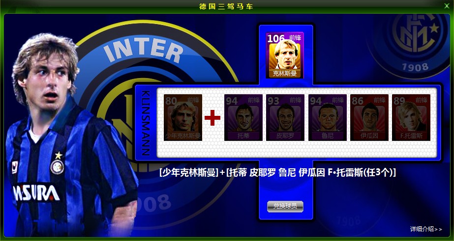 少年克林斯曼+托蒂、皮耶罗、鲁尼、伊瓜因、F·托雷斯(其中任意3个)可以合成巨星初始能力106前锋克林斯曼。