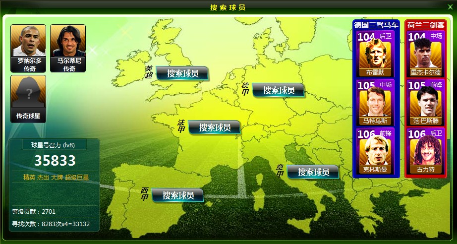 1、通过搜索德甲联赛有机会搜取到少年克林斯曼。玩家游戏等级达到61级才可进入合成窗口。合成巨星克林斯曼须消耗20万银币。