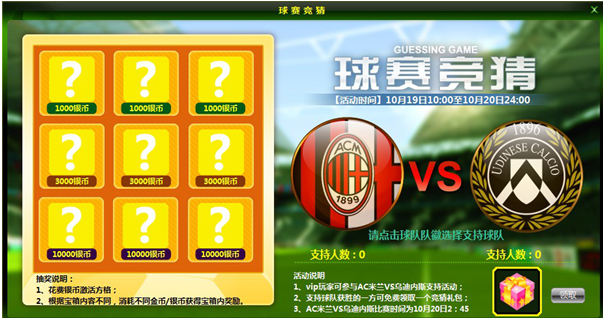 活动内容:在活动期间内,大家可以在九宫格宝箱开启大奖。但仅VIP功能的玩家可以选择支持AC米兰或是乌迪内斯,若支持的球队获胜,可以免费领取胜利竞猜礼包哟~里面装着限量积分卡2000点*2,签名积分卡5000点呢~