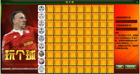 3、活动期间,每活动日截止24:00时,翻得第6个球消耗最少金币者,系统将免费赠送最佳RP大礼包,礼包内含:7级合同一个,5级装备套一套,战术积分卡10000点。同时,获得第9个球消耗最多金币者,系统将免费赠送安慰礼包,礼包内含:球员经验卡10000点,训练卡100000点,战术积分卡10000点,袖标4级*1。最佳RP礼包及安慰礼包会直接发放到符合条件的玩家背包中。