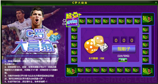 活动内容:在活动期间,在C罗大富翁活动中,玩家仅需花费50金币就掷出三个骰子,其中骰子最小的点数即为前进的步数,每一小格都有2张欧冠C罗升级卡,当然如果运气好落到除起点外的角落大格所获得的欧冠C罗升级卡会更多,当玩家拥有500张欧冠C罗升级卡就可以对球队中的初始能力106的欧冠C罗进行升级,升级后名称为顶薪·C罗,初始能力108。