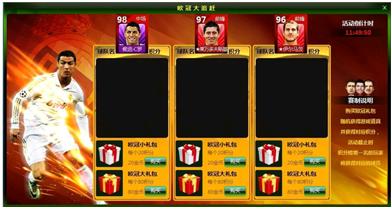 活动内容:活动期间内,在“欧冠大追赶”活动界面内购买礼包,不仅可随机获得欧冠之魂、球员装备、球员合同、教练合同、教练经验卡等道具材料,购买礼包还可获得积分,活动截止时积分榜第一者可获得兑换初始能力106的欧冠C罗所必须的妖人大牌球员呢~