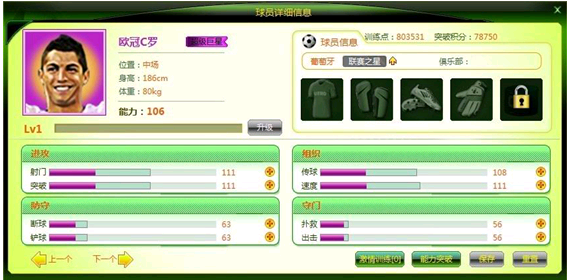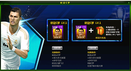 达到兑换条件后,点击兑换按钮即可获得初始能力106巨星欧冠C罗+欧冠大礼包呢!得到欧冠大礼包,你就可以让初始106巨星欧冠C罗瞬间提升级别实力,的确很强悍!