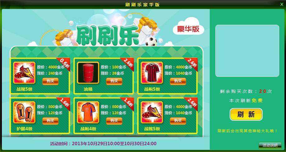 1、活动开启后,玩家点击“刷新”按钮可刷出6款随机道具及随机折扣,玩家有可能刷出免费购买道具的机会。