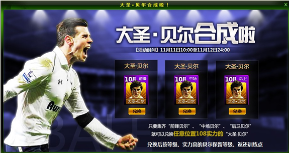 活动内容:在活动期间,玩家进入活动页面,界面展示着3个不同位置的球员“大圣·贝尔”,玩家如果拥有“前锋贝尔”、“中场贝尔”、“后卫贝尔”就可以免费兑换任意位置的一个“大圣·贝尔”,初始能力108哟~