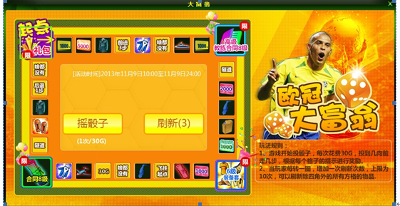 2、在界面的四角方格中,大礼尤为丰富哦。如玩家完成一圈刚好落在起点格上会获得起点礼包,内含:战术积分10000*5,银币兑换包(中)*5,欧冠之魂*10,教练经验卡5000点*5、训练点10000*5。内含的道具材料将会直接发放到玩家背包中,请注意查收。
