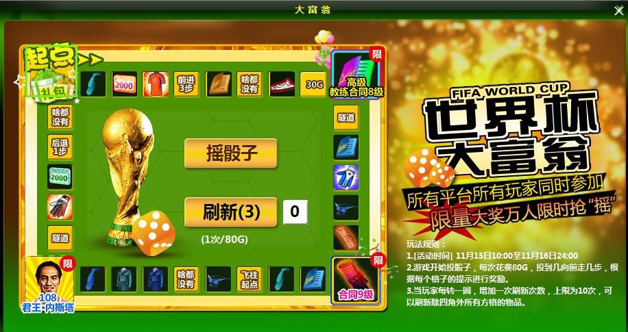 活动内容:在“世界杯大富翁”活动期间内,您仅需消耗80金币即可掷1次骰子,骰子显示几点就走几步。在世界杯大富翁之路上,除了有起点礼包,更有全区全服限量投放的高教8级合同*3、9级合同、巨星后卫初始能力108的君王·内斯塔哟! 全区全服限量的超级大礼,你一定不能错过机会。