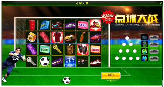 活动内容:在活动期间内,玩家参与点球大战活动,24件道具展现在球门框内,玩家仅需30金币点击射门按钮可随机获得一件道具哟,如果你射中了“足球”那你一定要攒起来,攒到10个“足球”,那点球至尊礼包就要免费为你送上啦~“足球”大奖领取次数有限喔!