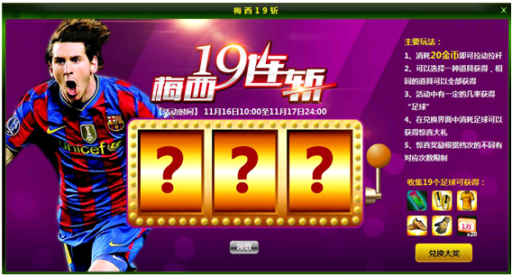 活动内容:在活动期间内,大家都来体验梅西19连斩那其乐无穷的游戏环节吧。玩家只需消耗20金币就可拉动一次摇杆,你就有机会获得相当丰厚的幸运道具或装备呢~