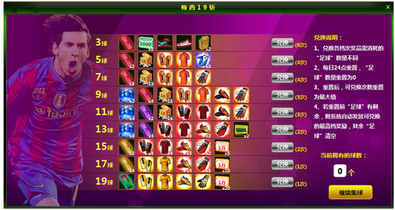 9球奖:欧冠之魂*2,合同5级*4,银币兑换包(中)*5,4级护腿*4,4级战袍*4,4级战靴*2,4级手套*2。每人每天可兑换3次。