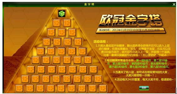 1、 玩家从金字塔最底层开始翻牌,每一层翻牌所消耗的金币也不同,花费明细如下:
