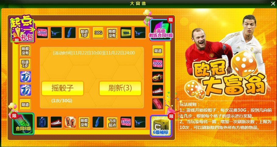 2、在界面的四角方格中,大礼尤为丰富哦。如玩家完成一圈刚好落在起点格上会获得起点礼包,内含:战术积分10000*5,银币兑换包(中)*5,欧冠之魂*10,教练经验卡5000点*5、训练点10000*5。内含的道具材料将会直接发放到玩家背包中,请注意查收。