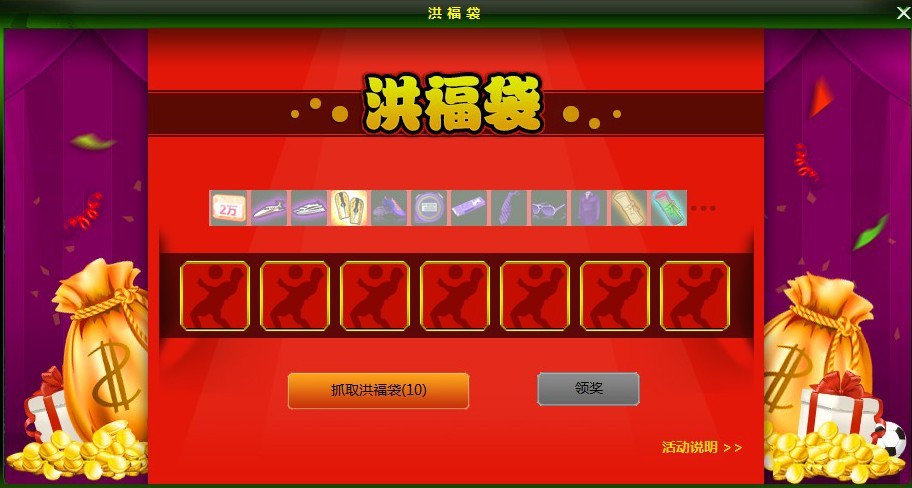 活动内容:活动期间内,快来“抓取洪福袋”!仅需30金币就可以开启洪福之旅,抓得洪福袋点亮道具奖励,更有8级合同,欧冠之魂,6级高教装备等等N多豪礼呢~心动不如行动,快来抓洪福袋!