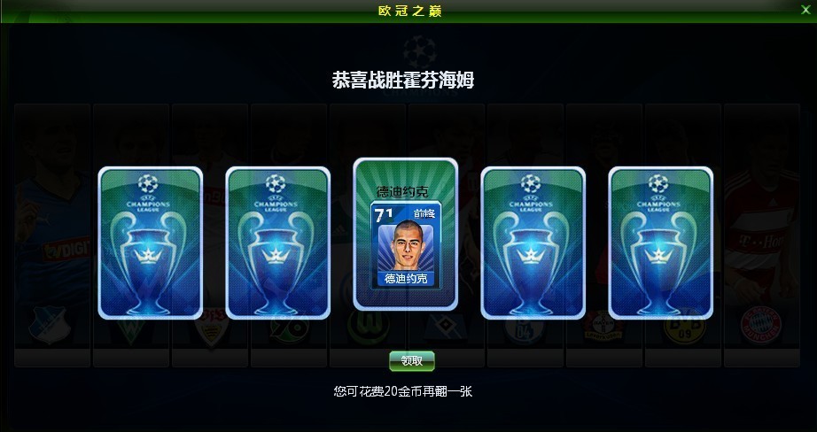 3、玩家挑战球队胜利后,进入翻牌奖励页面,此时有5张卡牌,第一张牌免费翻开,翻开卡牌获得相应奖励。玩家亦可以花费金币继续翻牌,第二张牌消耗20金币,第三张牌消耗40金币,第四张牌消耗60金币,第五张牌消耗100金币。