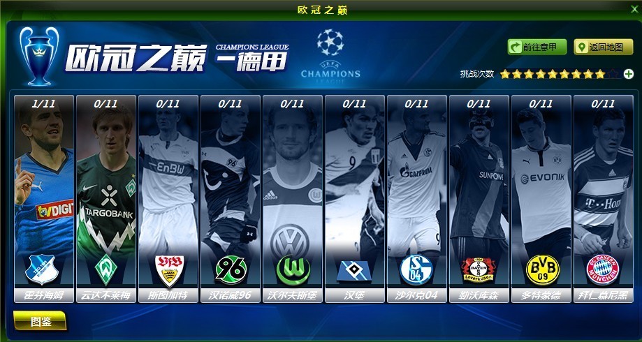 球星图鉴为欧冠之巅挑战赛每一支球队的阵容展示页面,每个球员只能被点亮一次。