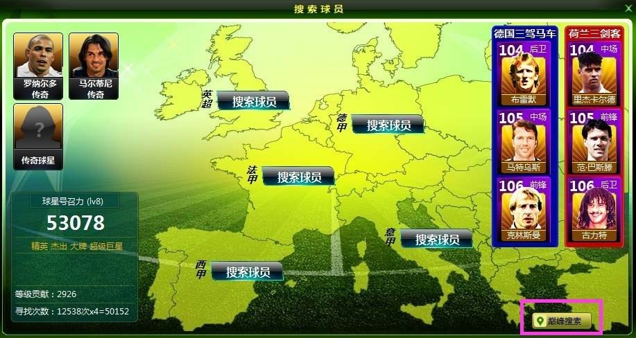 温馨提示:如果玩家进行普通搜索,也能搜索到巅峰搜索中的球员。但是巅峰搜索无法搜索到除欧冠之巅——挑战赛50支球队之外的球员。无论是普通还是巅峰搜索都会消耗汽油等搜索资源,也同样增加球星号召力。