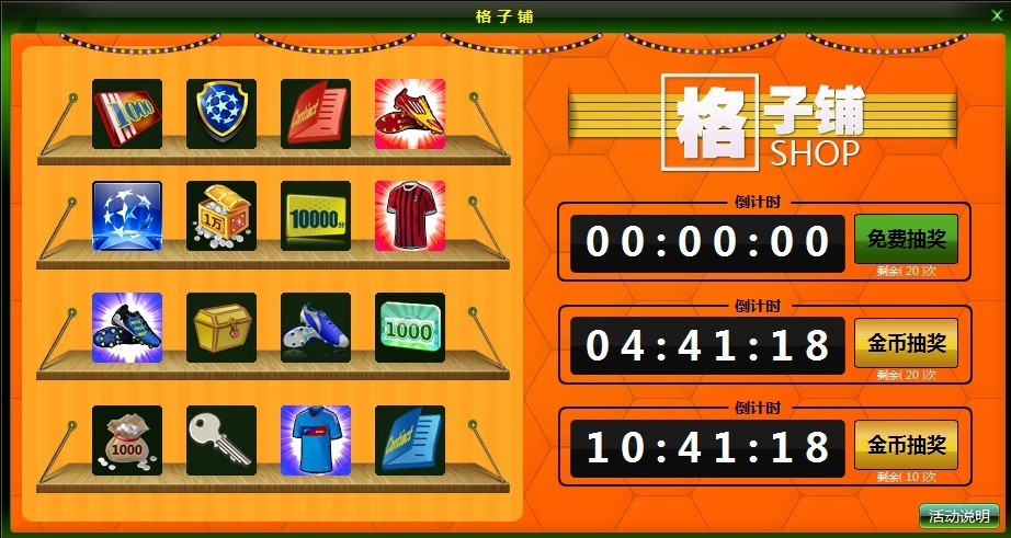 活动内容:活动期间内,格子铺设立3档抽奖,倒计时归0时,即可进行格子铺免费抽奖,格子铺为大家准备了精美大礼,欧冠勋章、欧冠之魂、银币兑换包(中)、限量积分、战术积分等超级幸运奖期待你来抽取哦~分秒必争的你,如果不堪忍受等待之苦,也可以立即花一定量的金币进行抽奖哦!每日每人抽奖次数有限,机会难得哦!