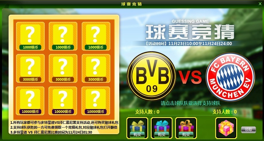 在活动界面中出售三种礼包,即:多特胜利礼包,打平礼包,拜仁胜利礼包。若玩家购买的礼包与赛果一致,打开礼包奖励翻倍。