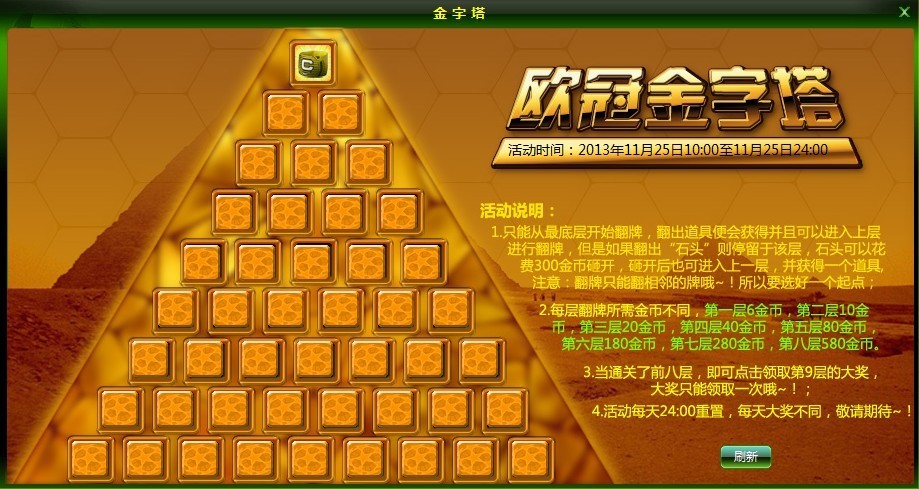 1、 玩家从金字塔最底层开始翻牌,每一层翻牌所消耗的金币也不同,花费明细如下: