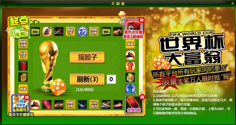活动内容:在“世界杯大富翁”活动期间内,您仅需消耗80金币即可掷1次骰子,骰子显示几点就走几步。在世界杯大富翁之路上,除了有起点礼包,更有全区全服限量投放的里杰卡尔德5级签名袖标、9级合同、里杰卡尔德6级签名套装(不含袖标)哟! 全区全服限量的超级大礼,你一定不能错过机会。