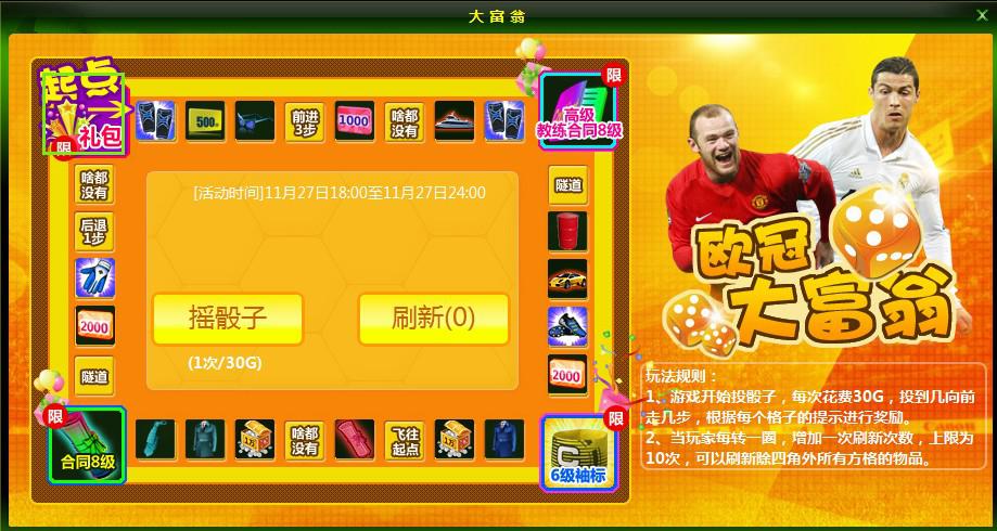 活动内容:在活动期间内,玩大富翁仅需消耗30金币即可掷1次骰子,骰子显示几点就走几步。各种妙礼遍布在你的大富翁梦想之路上。富翁角落大礼高教合同8级*2,6级袖标*1,8级合同*3,起点礼包呢,如此这般梦想之礼看你有没有福气得到喽~