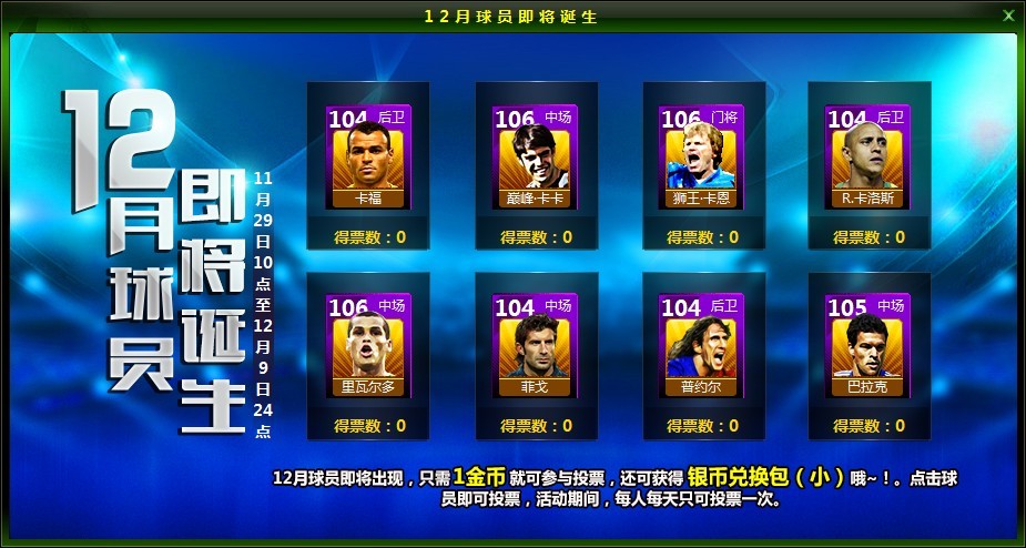 活动内容:在活动期间内,玩家参与选举下一届培养球员,界面中8位球星,玩家仅需花费1金币对自己所喜爱的球星进行投票,最终根据投票结果确定12月球员。根据大家的选举,最终敲定的12月球员能力可以进行培养,某些球员的初始能力最高可以培养至109哟~12月球星八选一,谁是你的菜,咱自己说了算。