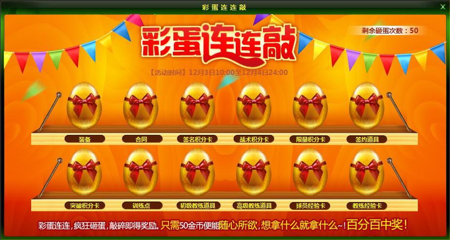 玩家每敲一颗蛋需要50金币,每个活动日每人最多只能敲50次。12月3日24:00活动重置敲蛋次数。
