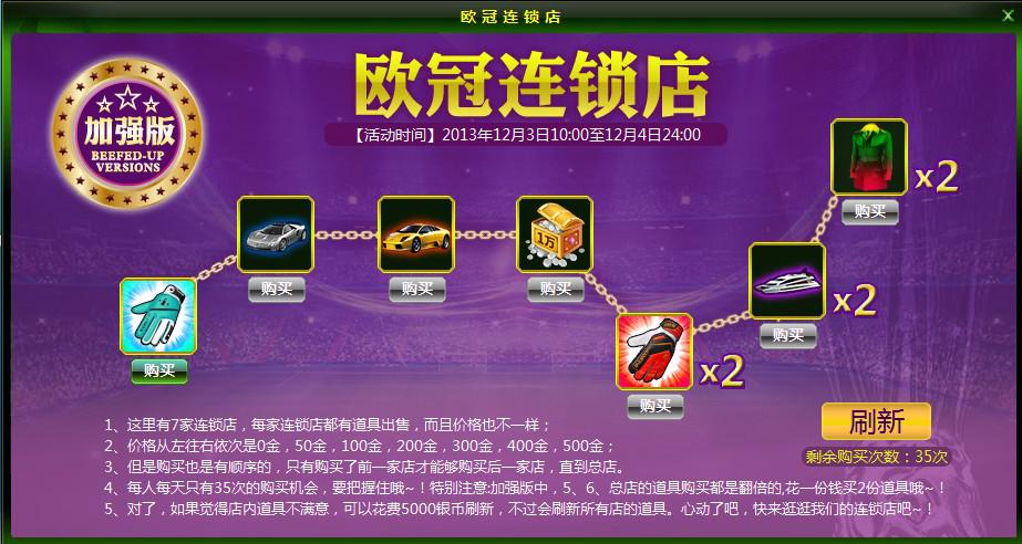 活动内容:在活动期间内,让我们一起涌入“欧冠连锁店”吧,界面中依次有7家店铺,每家店铺都出售一种道具。玩家按照店铺顺序购买,1号店道具免费购买喔~剩下的店铺需使用金币(活动券)购买道具。每人每天能购买35次呢~如果你对上架的道具不满意,还可以消耗5000银币刷新哟,说不定能刷出更好的道具呢~