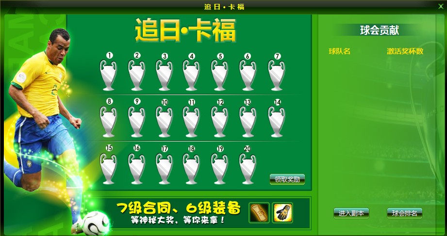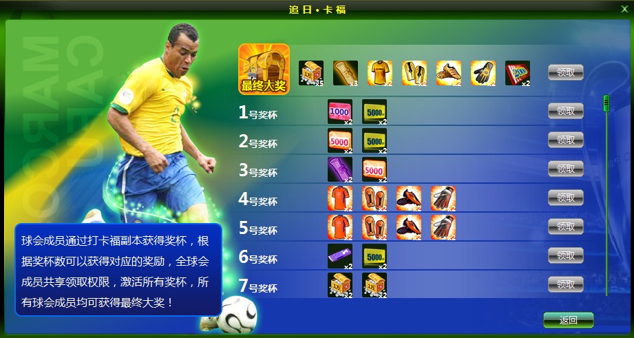 活动内容:“追日-卡福”活动以球会为单位进行,球会成员每通关一次卡福副本可随机获取并点亮一个对应号码的奖杯,此时球会成员可领取一次对应号码奖杯的专属奖励,更值得期待全部奖杯点亮时的最终大奖呢!奖励领取次数有限喔~大战来临,快拿出卡福的状态来!