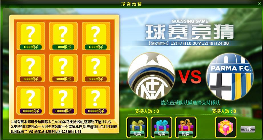 2、12月7日10:00-12月8日24:00玩家选择支持国际米兰或是帕尔马,玩家只能选择支持一支队伍,支持选定后将不可更改。若玩家所支持的球队获胜,那么在12月9日10:00-24:00,玩家可以在活动界面领取胜利竞猜礼包1个。胜利竞猜礼包内含:限量积分卡2000点*2,签名积分卡5000点。