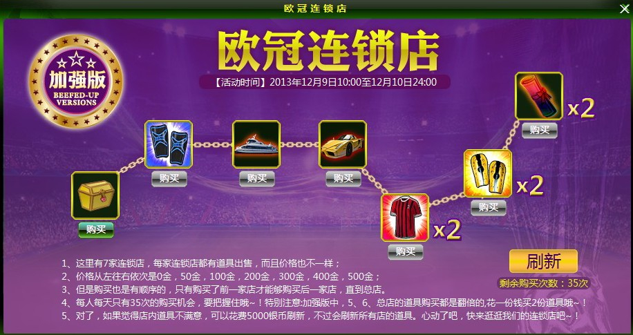 活动内容:在活动期间内,让我们一起涌入“欧冠连锁店”吧,界面中依次有7家店铺,每家店铺都出售一种道具。玩家按照店铺顺序购买,1号店道具免费购买喔~剩下的店铺需使用金币(活动券)购买道具。每人每天能购买35次呢~如果你对上架的道具不满意,还可以消耗5000银币刷新哟,说不定能刷出更好的道具呢~